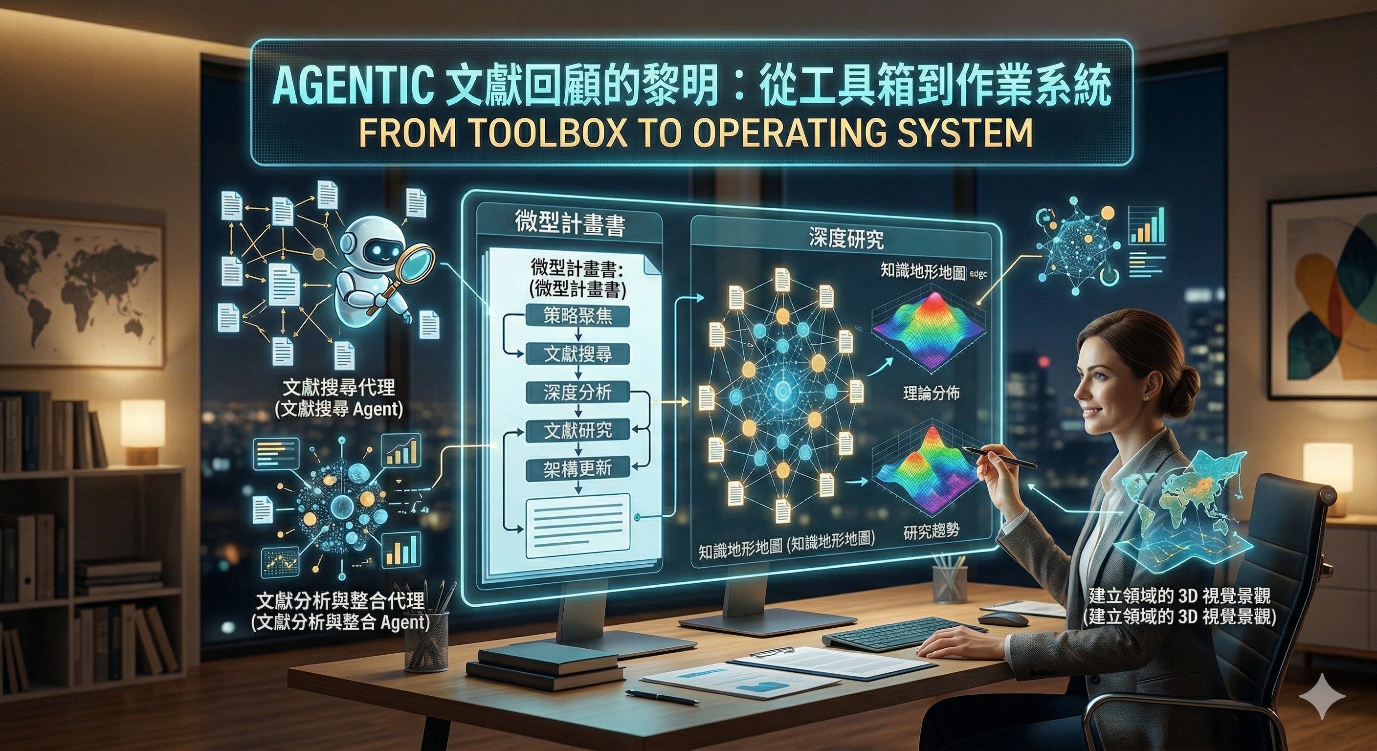 本文回顧第一期「AI 深度研究」核心方法論,並正式揭曉第二期升級藍圖。學術研究正從「工具應用」邁向「代理化(Agentic)」。我們將結合微型計畫書與智慧代理人,為研究者打造動態、自動化的文獻回顧框架。